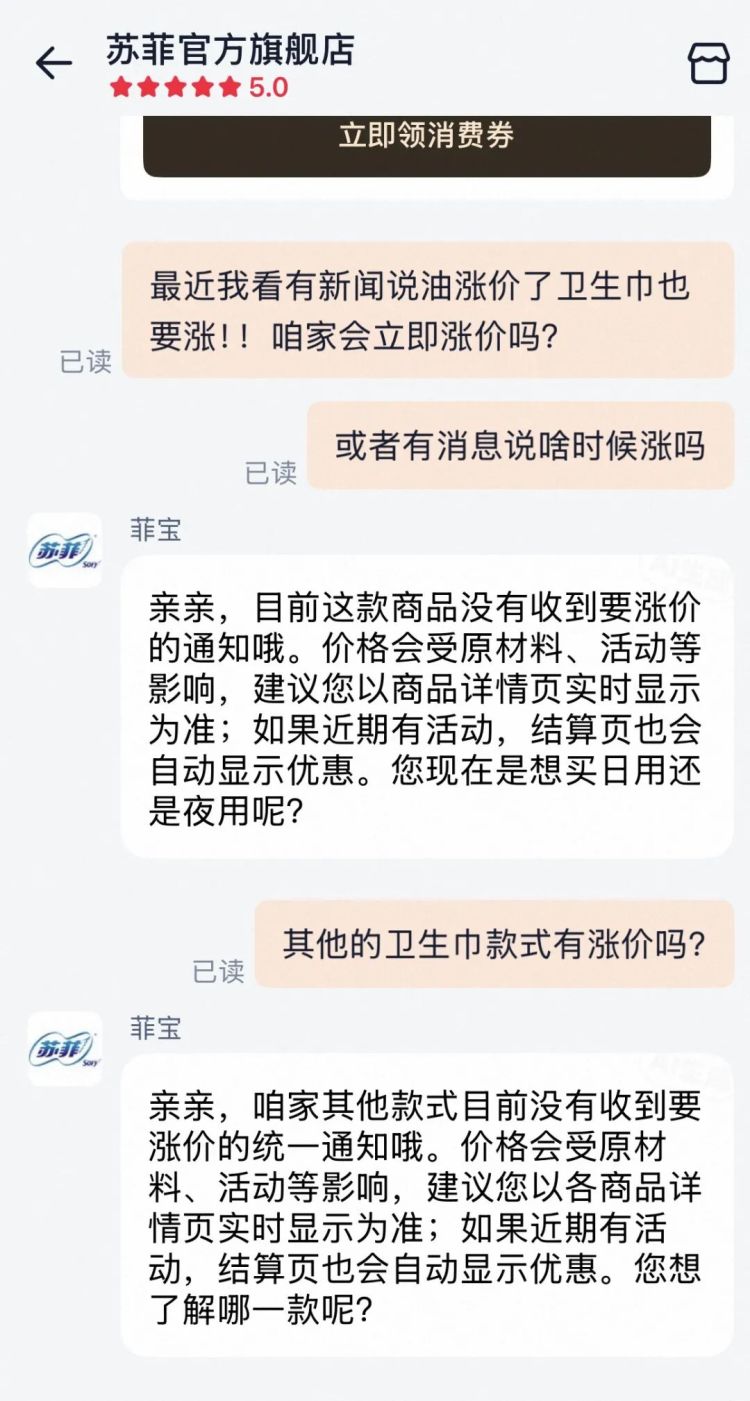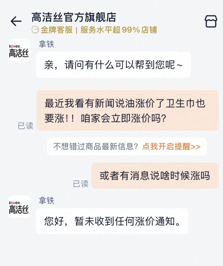 7日,中新经纬以消费者的身份进行咨询,护舒宝、高洁丝、全棉时代、她研社、苏菲、淘淘氧棉等卫生巾品牌客服均表示,目前暂未接到价格变动的通知。